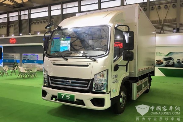 此外,比亚迪还展出了城市物流领域的代表性成果T5A。T5A纯电动卡车主打城市物流配送市场,采用铝合金车身和货箱,整车电量为84.4kWh,载货空间达17m³,综合工况下满载续航里程超过200km,可有效满足城市配送的市场需求。同时,得益于动力电池热管理系统等领先科技,今年1月至8月,比亚迪T5A以优异表现完成哈尔滨极寒及吐鲁番高温测试,检验了其在极端环境中的产品可靠性和安全性。