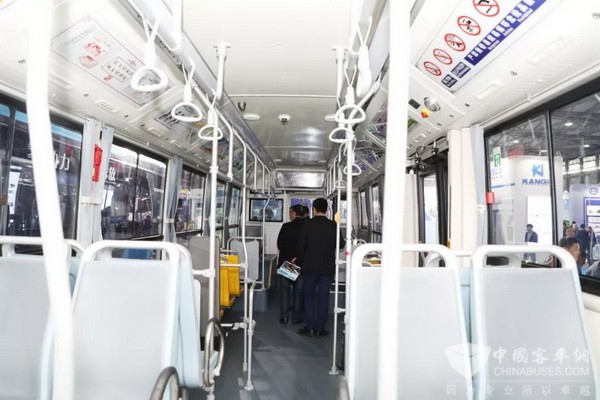 整车采用30%高强度钢混搭方式,应用多项轻量化新材料,不仅为整车“瘦身减重”,而且使车辆“坚实可靠”。车身三门全通,加车厢离地小于340mm的低地板设计,让乘客上下自如。同时,中车电动自主研发的“双绕组”电机也现身展会。