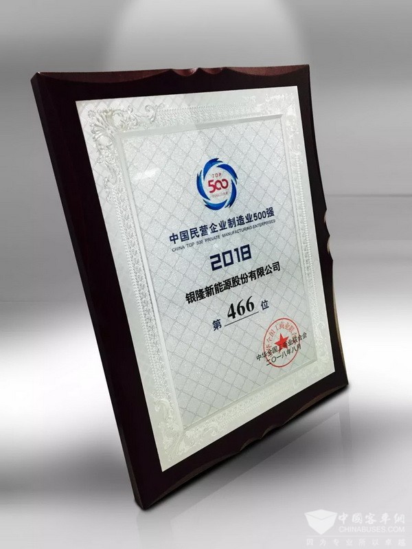 8月29日,中华全国工商业联合会公布的“2018中国民营企业制造业500强”,银隆荣誉上榜。