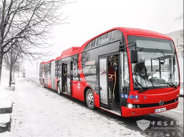 比亚迪制造,在挪威投入使用的纯电动铰链大巴