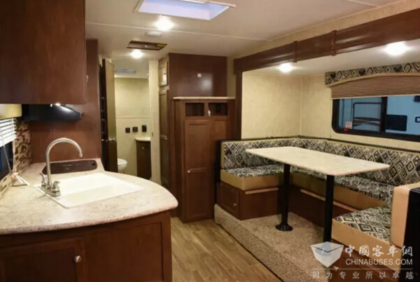 内饰方面,中通逸居 LCK9030YKTV系列营地拖挂房车家具采用防腐地板、耐磨地板革、生态环保板材打造,内置双人床、床头柜、高档 U 型皮革沙发(可转变成床)、高档酒柜、高档影视墙、电视柜、32寸液晶电视、皮革吊顶。另外,厨房区配备的是一款50L冰箱。卫生间为干湿分离式设计,卫生间配备了排风扇、豪华洗手盆/冷暖双水水龙头、化妆镜、电热水器、高档石英石台面洗手池、化妆镜、豪华淋浴间等设备等生活用具。具体车型可根据客户需求进行选装,满足各类客户的定制化需求。