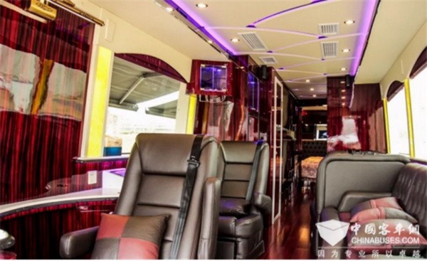 暗红色的饰板和地板配以黑色的皮质座椅,让整个车内的氛围变得高档起来;打开室内全部灯光,给人的感觉像是星级酒店。360°可旋转座椅搭配办公台面,办公可以照常;工作之余吧台来一杯红酒体验美好生活,纵置沙发组合加上对坐沙发,不管是会客还是开个party都绰绰有余。