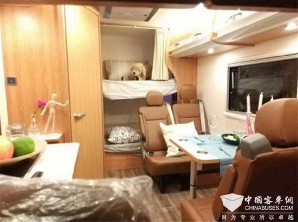 亚星欧睿采用全承载车身,其舒适性好、噪音小,全承载车身设计实现车内空间最大化。车厢配置上,整体风格温馨带有豪华,座椅采用皮质包裹,同时副驾驶的座椅可向后旋转,在旅途生活中可以与车厢中的乘客面对面的沟通。车内配置上,厨房炉灶、双人床、卫生间、冰箱等房车基本功能都有配备,短期短途出游完全没有问题。