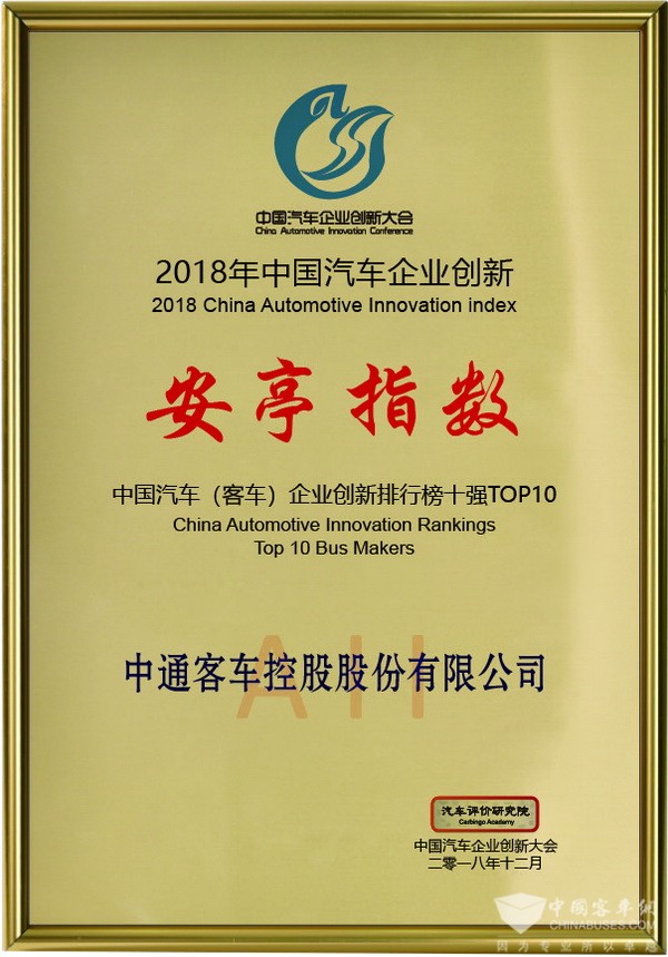 会上,发布了标志着中国汽车企业创新水平的安亭指数,中通客车荣登中国汽车(客车)企业创新排行榜第二名。