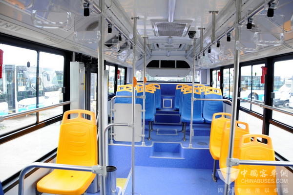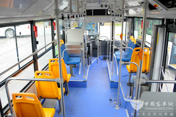 另外,车辆的座椅内饰也进行了优化布局,在保证座位数的前提下实现了空间的舒适,车内设有19个座位,其中4个为 “爱心座位”,体现了对老弱病残孕人群的关爱。同时,车辆还根据客户的建议,定制了蓝色的地板,既清新又有质感。