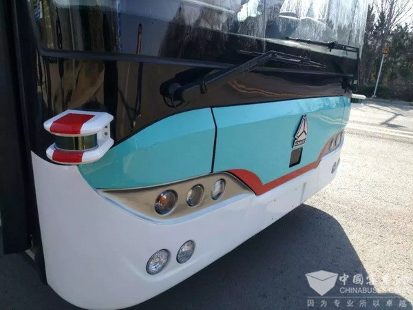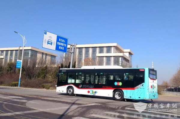 上午10:00,中国重汽无人驾驶公交车驶入科远路进行调试,沿测试道路行驶。该车车身为白蓝色,车身两侧印有“自动驾驶电动客车”字样。