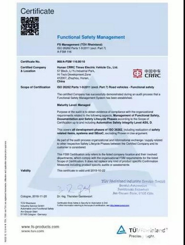 2018年11月,中车电动获得了德国顶级认证机构莱茵TÜV集团颁发的ISO26262道路车辆功能安全管理体系认证证书,成为国内首个通过该项认证的新能源商用车整车制造企业。
