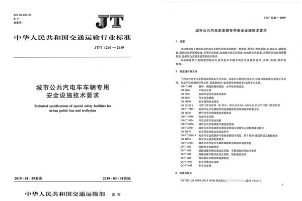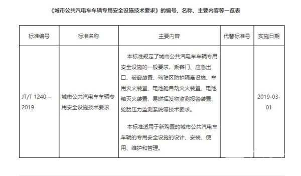 交通运输部关于发布交通运输行业标准《城市公共汽电车车辆专用安全设施技术要求》将于2019年3月1日开始正式实施。