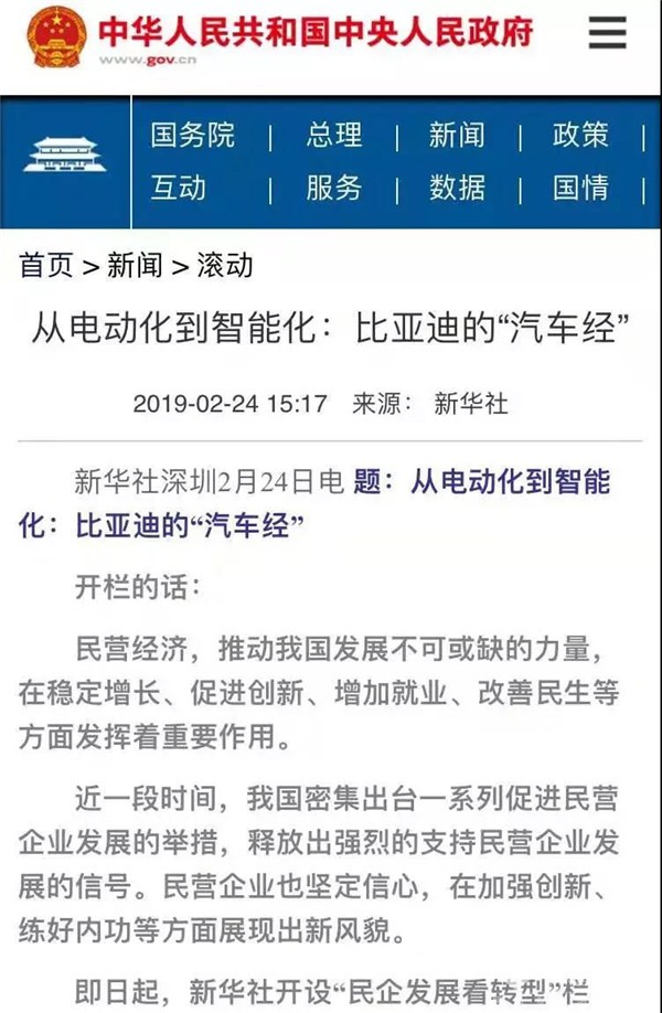 2019年2月25日,央视《新闻联播》用超过3分钟的时间,讲述了民营企业比亚迪的转型创新之路。几乎同一天,《人民日报》、新华社、《光明日报》、中央人民广播电台等也纷纷聚焦“民营企业转型升级”,推出了专题报道,系列专栏开篇均以比亚迪为案例。