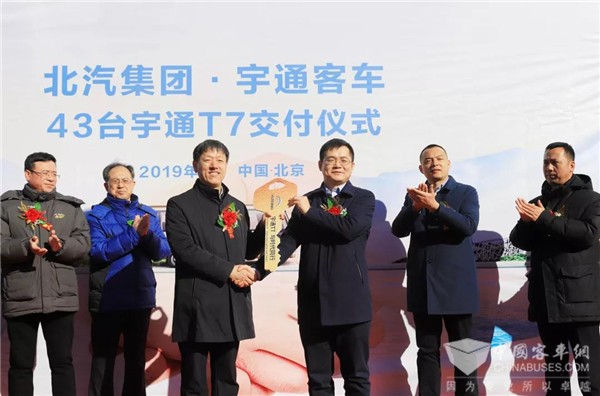 宇通客车营销副总监王文韬(左四)向北汽集团董事长张峻峰(左三)递交了象征车辆交付的“金钥匙”