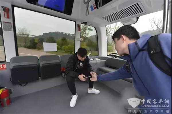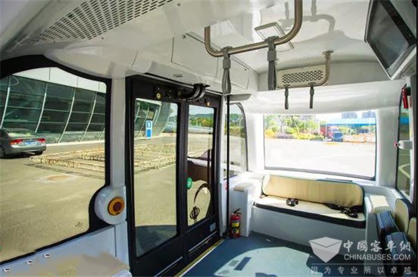 无人驾驶巴士内始终有一名安全员,他会叮嘱顾客系好安全带,车内角落的平板电脑可控制车辆行驶。乘客系好安全带后,车自动关上车门,根据系统事先设定的路线行进。