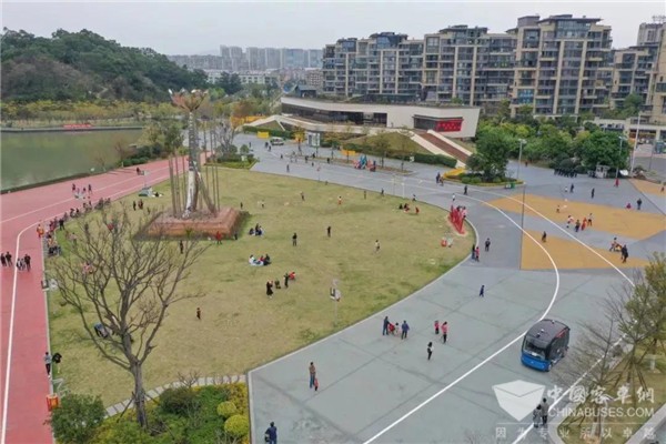 走进飞凤山奥体公园,首先能看到的就是——金龙“阿波龙”无人驾驶巴士!