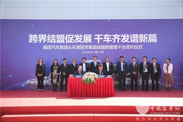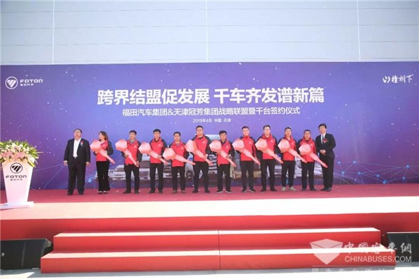 2019年4月14日,以“跨界结盟促发展 千车齐发谱新篇”为主题的福田汽车集团&天津冠芳集团战略联盟暨千台签约仪式于天津冠芳集团正式举行。在市场监督管理局专家组的见证下,福田汽车集团与天津冠芳集团等知名软饮料企业签署战略合作协议,携手共赢;同时,福田汽车与天津冠芳集团正式签约2000台福田图雅诺、风景。福田汽车作为以“突破科技、引领未来”为己任的国有企业,正在切实促进国家经济高质量发展,双方也将携手把商品可追溯落到实处,切实为消费者保驾护航。