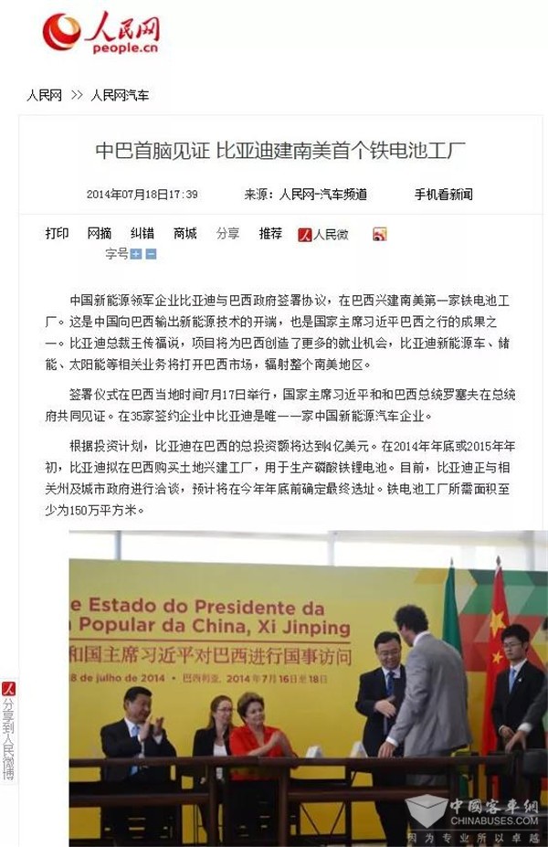2014年7月,习近平总书记见证比亚迪签约南美首个铁电池工厂项目。