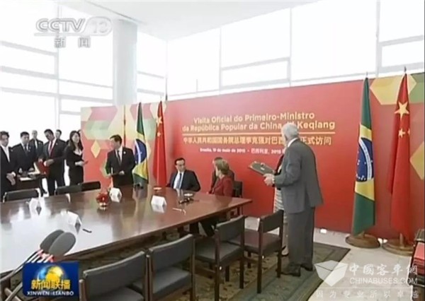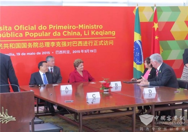 2015年5月,李克强总理见证比亚迪与巴西最大巴士制造商马可波罗签约。