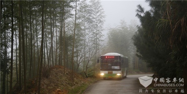 “窄、陡、险,弯道非常多。”孙黎平说。这段路尽管是水泥路,但宽度不足3米,且弯道超过50处,甚至有多处“发卡弯”,盘山路两旁是湍急的溪流或长满毛竹的陡崖,以及突兀的山体。由于山上海拔达1000多米,所以冬天有时会下雪,雨天则云雾缭绕宛若仙境,路面湿滑不说,遇到道路塌方也是常有的事情。这样复杂的道路通行条件,开行公交线路,无疑需要勇气和担当。