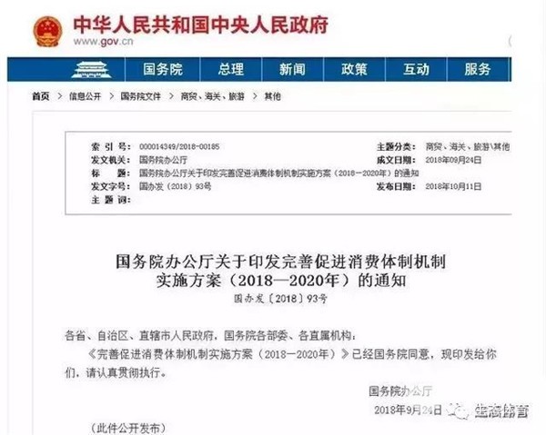 2018年10月11日国务院印发了关于《完善促进消费体制机制实施方案(2018—2020年)》的通知。