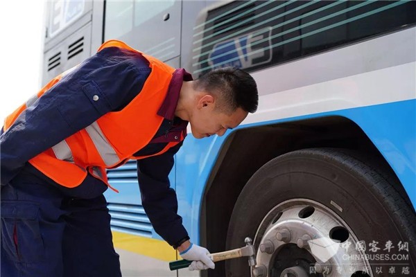 检测人员正在检测即将出发的欧辉客车