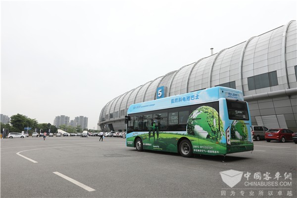 2019年6月18日上午七点,车身以蓝绿为主色调、印有“氢燃料客车”字样的公交车载着工作人员,从福州洪山园路出发前往海峡国际会展中心,途经大桥南二环路快速路、林浦路,十五分钟后,到达海峡国际会展中心广场下车点,全线单程15公里。展会期间,这辆氢燃料客车将往返于这条线路。