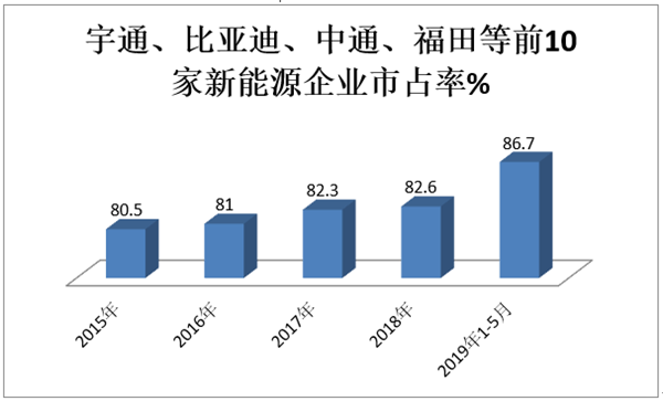 相关数据显示,主流新能源客车企业近年市场集中度为: