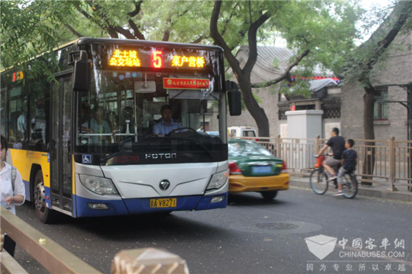 在北土城公交厂站等了大约5分钟,5路公交缓缓驶来。黄黑色的车身搭配着蓝色底纹,与老北京城的红墙碧瓦正是相应。车头挡风玻璃右上角还贴着“北京市工人先锋号线路”的红色条幅。今日的5路公交又换了新颜-福田欧辉BJ6160C6CCD城市客车。