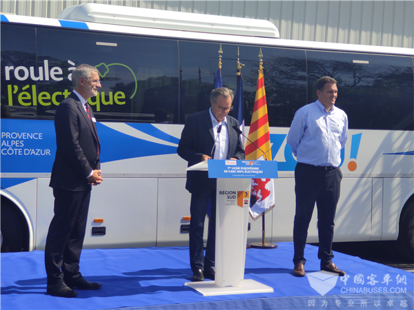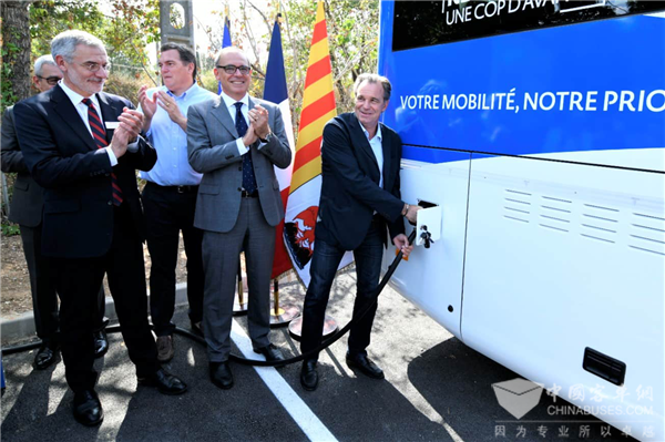 当地时间2019年9月19日,欧洲第一条纯电动城间车线路正式启动——10辆宇通ICe12纯电动城间车在法国普罗旺斯地区艾克斯投入运营,该批车由欧洲国际运营商Transdev集团采购。法国普罗旺斯—阿尔卑斯—蔚蓝海岸地区主席雷诺·米瑟利耶,Transdev集团董事长兼首席执行官蒂埃里·马尔莱特等领导出席启动仪式现场,共同见证欧洲在绿色出行领域所取得的里程碑式成果。