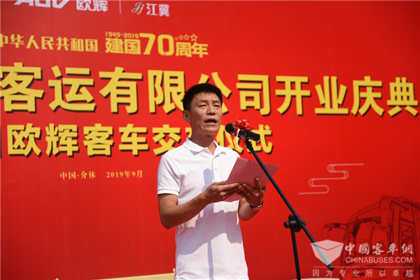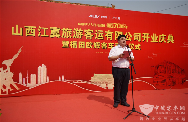 江冀集团董事长李红江在致辞时表示:“在举国欢庆新中国成立70周年之际,山西江冀客运应需而生,装备精良,整装待发,将以崭新的姿态喜迎祖国生日和来自各方的嘉宾。作为介休市的一家大型旅游客运公司,能够有幸参与介休市旅游客运建设,承担起发展旅游事业的责任,我们感到无上的光荣。”