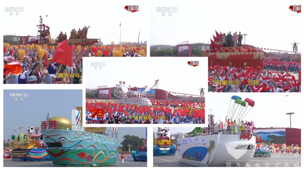 5辆彩车根据不同的主题,选择独具特色的文化符号进行设计,展现了新中国成立70年来人民的精神面貌和地域发展特色。
