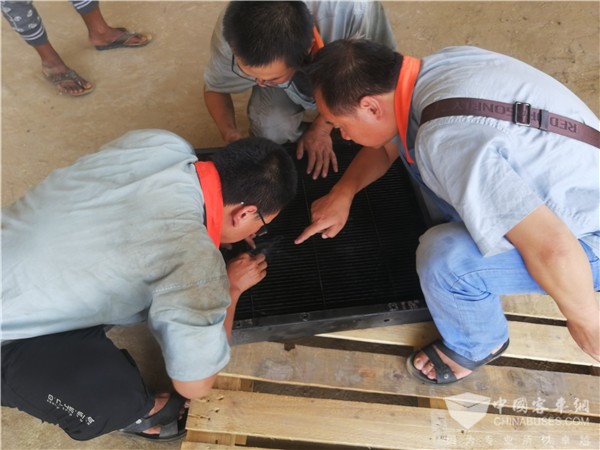 9月1日是学校开学季,校车要正式投入运营,服务人员做完PDI全车检查,客户就立马将车辆进行了分配。其中有台7米的校车,运营几天后,发动机报高温故障,经检查,发现水箱漏水导致这一故障。当时,距离校车接学生放学不到四个小时的时间,为在放学前维修完毕,服务人员当机立断,将水箱拆卸下来将漏水之处进行焊接。拆解水箱时正是中午,气温达到了48℃,车内像蒸炉一样,每个人都大汗淋漓,经过三个小时不断努力抢修,车辆总于赶在学生放学前半个小时维修好了,客户对他们竖起了大拇指。