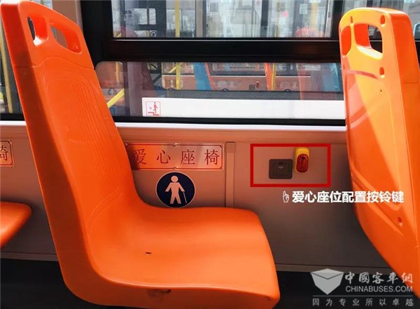 爱心座椅位置配置了下车按铃键,方便有需要的乘客能及时按铃,贴心呵护,温馨出行。