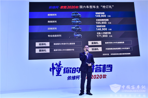 2019年11月1日,中国国际商用车展,依维柯欧胜2020款国六车型正式上市。产品覆盖超瑞、商瑞、运瑞、专业底盘4大系列,满足国六B排放标准,拥有更强动力,更低油耗,售价146900元起,以世界级制造的领航实力和更懂用户需求的性能优势,再树行业新标杆。