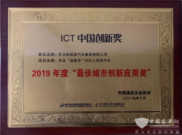 同期举行的“ICT中国•2019高层论坛”未来城市发展论坛上,开沃“蓝鲸号”5G无人驾驶汽车项目荣获2019年度ICT中国创新项目最佳城市创新应用奖,实至名归。