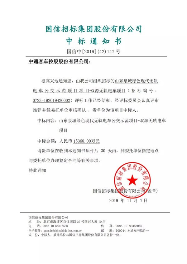 再传喜讯!中通客车中标济南公交亚行项目140台双源无轨电车订单