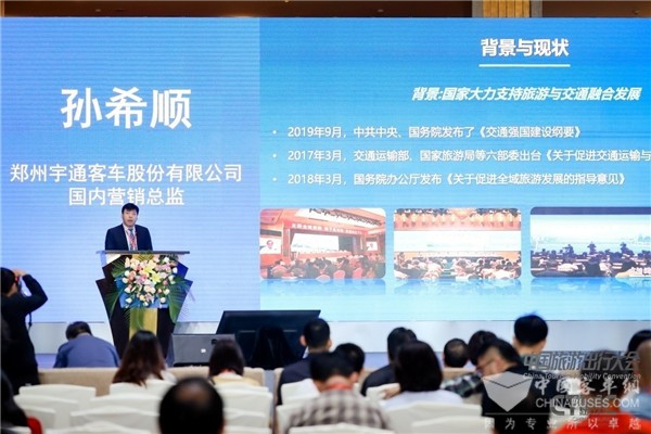 宇通客车国内营销总监孙希顺在大会现场发言时表示:“随着旅游出行产业的持续探索和发展,旅游客运形态已经发生了巨大改变,逐渐适应旅游消费升级需求。旅游客运企业需要主动拥抱变革,充分借助互联网、大数据、人工智能等现代信息技术延伸产业链,积极谋求交旅融合。而先进的交通工具,不仅是构成现代旅游的第二场地,也是增强旅游吸引力、促进旅游发展的重要因素。客车生产企业也需通过提升产品配置、服务能力及加强互联网技术的应用,落实创新、绿色、开放、共享的发展理念,创新旅游出行产品、提升旅游出行服务保障,加速交旅融合。宇通客车将持续以前瞻性的姿态,不断进行产品创新升级,为未来旅游美好出行做出更大的贡献。”