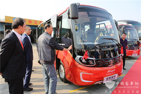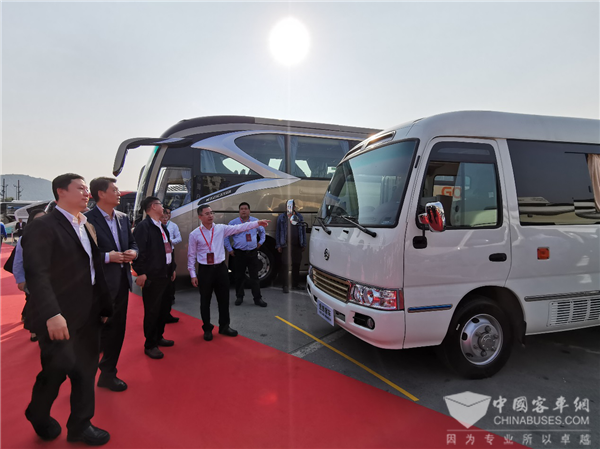 厦门金旅董事长彭东庆陪同中国旅游车船协会会长赵金俊等领导和嘉宾参观金旅展车