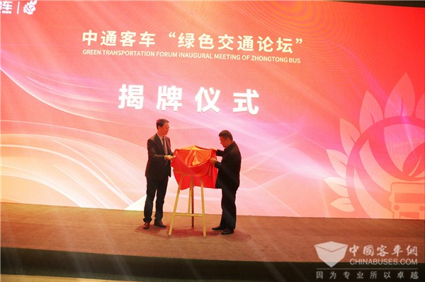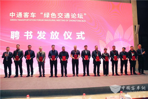 首先,铜川市公共交通有限公司董事长司宝君与中通客车董事长孙庆民共同为中通客车“绿色交通论坛”揭牌。孙庆民董事长为12位论坛委员颁发聘书。