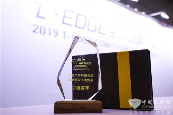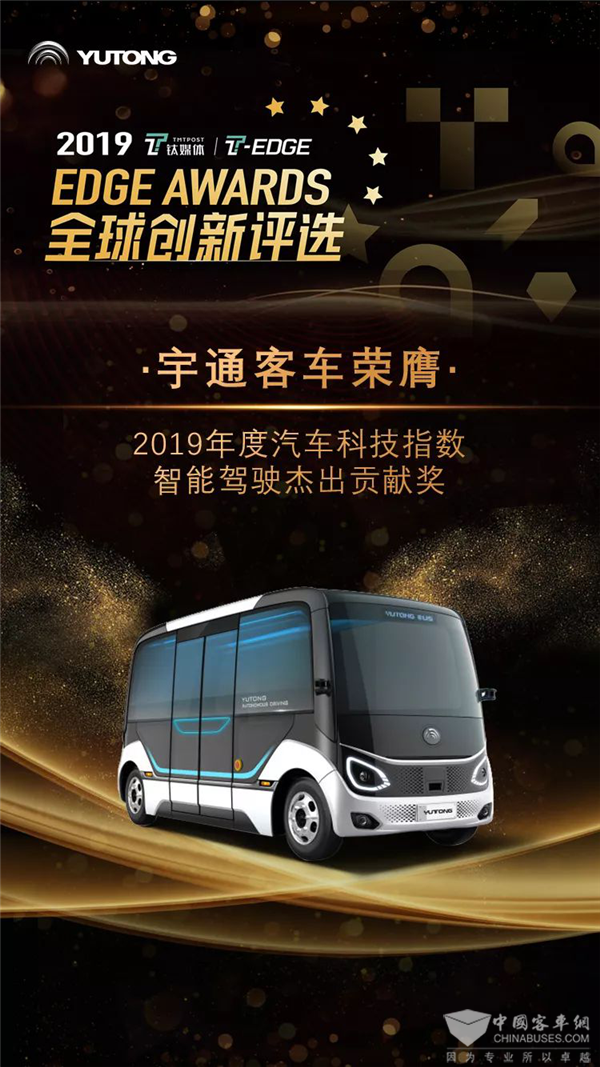 2019年12月8日,2019 T-EDGE全球创新大会完美收官,宇通客车凭借在自动驾驶领域的杰出贡献,荣膺2019年度汽车科技指数智能驾驶杰出贡献奖!
