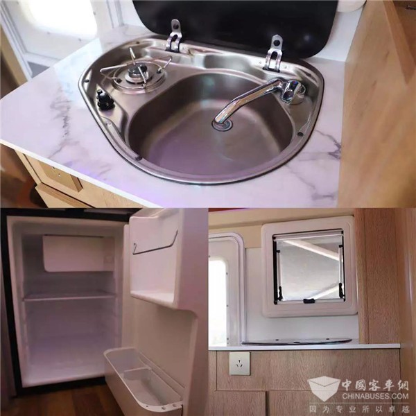 在休闲区的旁边就是一个小巧精致的厨房安装了镶入式电磁炉和洗菜池做一些简餐、洗洗水果、烧烧热水问题不大,下至的储物柜里可以摆放一些调味品餐具等,冰箱镶嵌在车尾部的双人床下,不占空间容量大。