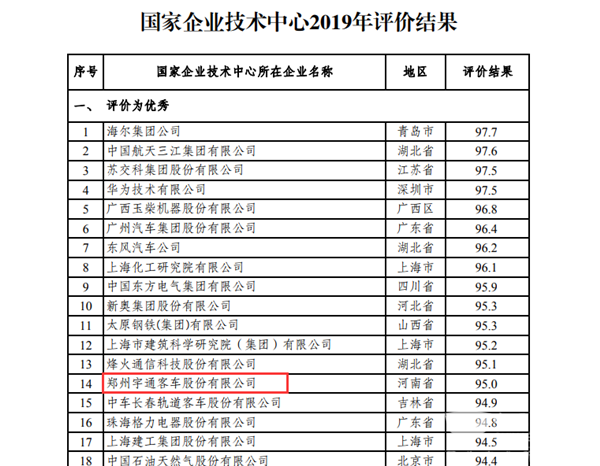 2019年12月23日,国家发展改革委发布了国家企业技术中心2019年评价结果,共有1563家企业参与评价,其中,宇通客车以95分的优秀成绩登榜,成为榜单中唯一一家达到“优秀”级别的客车整车制造企业。