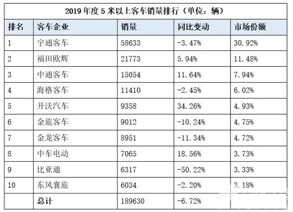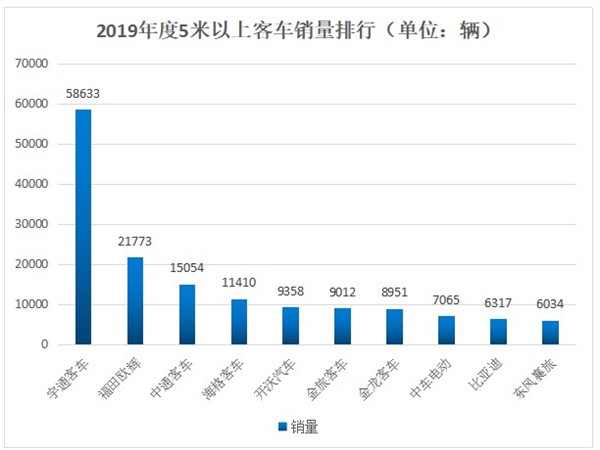 从年度整体销量表现来看,2019年,宇通客车累计销量达58633辆,市场份额高达31%,是排名第二位企业销量的2倍多,堪称行业最大赢家。排名第二的福田欧辉年销量也是超过2万台,较去年同期实现了近6%的增幅。中通客车、海格客车分列三、四位,年度销量同样超过万台。