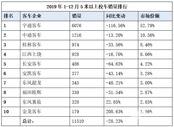 2019年全年,5米以上校车的整体行业销量为11510辆,占比6.03%,较2018年同期占比减少1.71%,销量同比下滑高达28.23%。