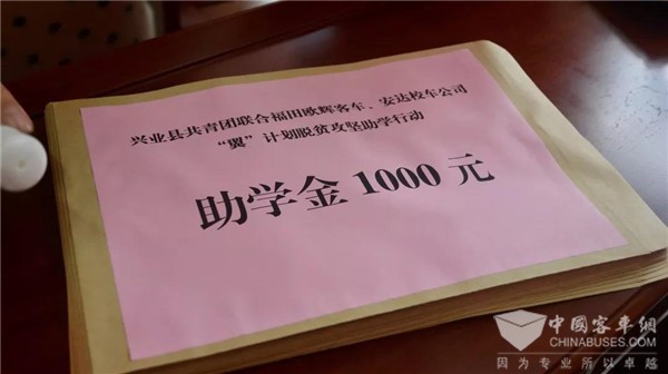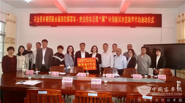 启动仪式上,福田欧辉客车携手安达校车公司向兴业县共青团“‘翼’计划脱贫攻坚助学行动”捐献助学金2万元、慰问品20份,助力贫寒学子圆梦成才,也为推进我国经济欠发达地区的青少年教育事业贡献了一份力量。