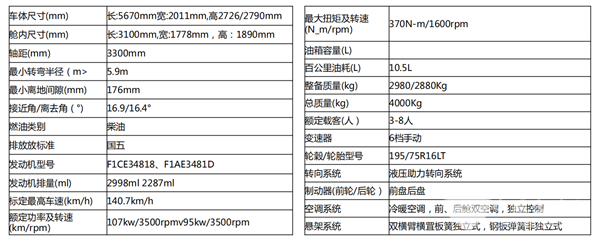 动力:依维柯欧胜车型匹配F1C3.0t涡轮增压发动机,功率为107kW,扭矩为370N.m,动力强劲。
