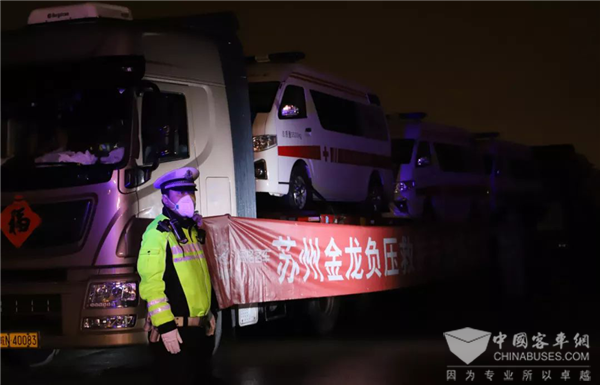 2020年2月13日晚,位于江苏苏州工业园区的苏州金龙唯亭停车厂里,一辆辆崭新的白色负压救护车被装上板车整装待发。这批车是苏州金龙这一周来加班加点赶制而成,它们承载着苏州金龙对武汉的期盼和祝福,在苏州市、江苏省、安徽省交警部门的接力护送下,正式踏上了驰援武汉“抗疫前线”的征程。