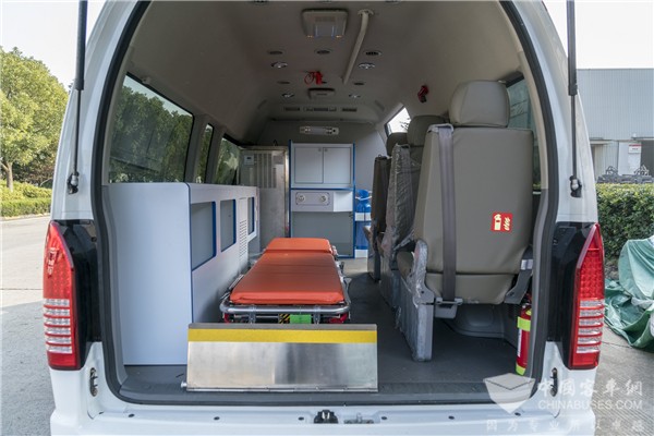 不同于普通救护车,负压救护车主要用于传染病人的急救和转运、降低周围人员感染率。为了提高生产效率,苏州金龙的这一批负压救护车医疗舱结构使用模块化设计方案,舱侧配有3个医生座椅,车内有多个储藏空间用于放置医疗设备。