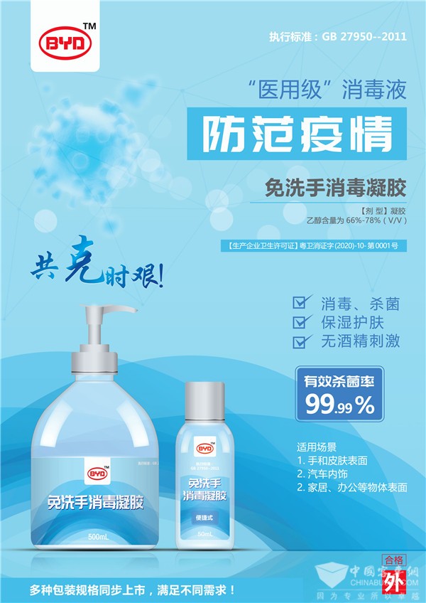 继援产口罩、消毒液后,比亚迪医用免洗消毒凝胶再度驰援抗疫