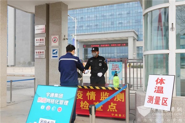 在宇通工业园区的门岗处,测体温、刷工牌、出示通行码,一切都有条不紊地进行着。