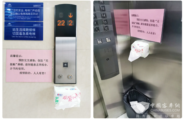 进电梯前,有免洗的消毒洗手液、纸巾和温馨提示。针对高频使用的电梯间,宇通还制定了严格的消毒管理制度。防疫消毒组对电梯区域进行“定频无死角”消毒消杀,确保将病毒传染的风险降到最低。