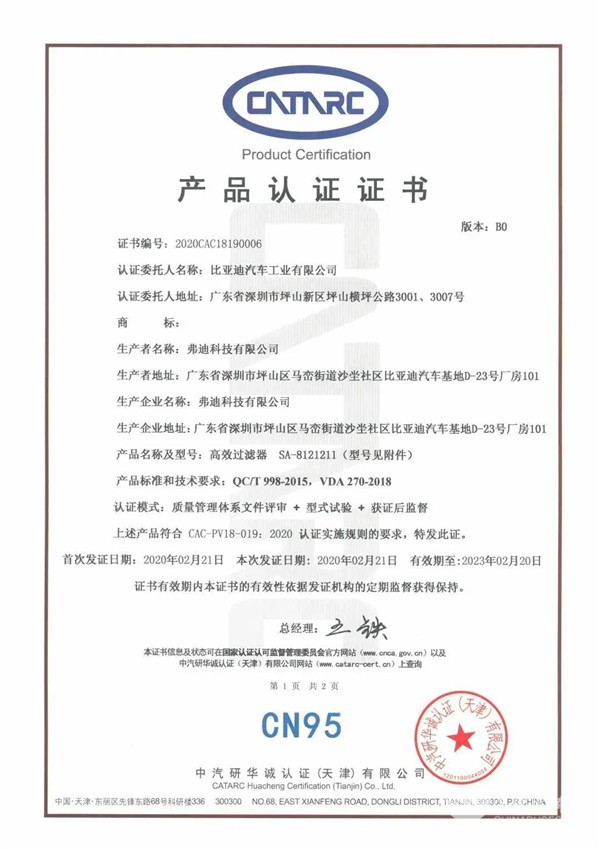 在实现整车换气的基础上,同时搭载绿净空气质量智能优化系统,装置集成空调回风口,新旧车辆均可加装,可实现快速自动检测车内外PM2.5浓度并自动开启净化系统,协同进行高效空气净化。后续还将配备比亚迪研发并已获首批汽车空调滤清器过滤最高等级认证——“CN95级”的空调过滤器,进一步提高客车空间的空气安全防护能力。
