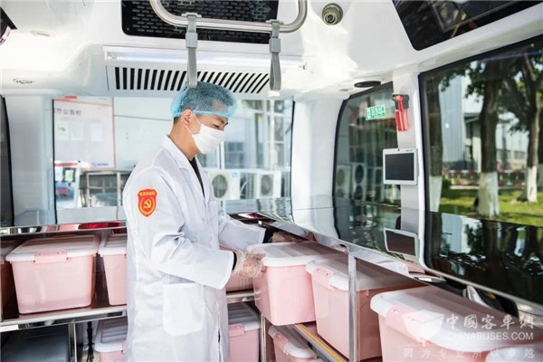 专为防控新冠肺炎疫情改制的金龙阿波龙“无人送餐车”继承了阿波龙容积大的特点,在车内安装平整的餐架,单趟配送餐盒份数可达400余份,单台车一小时内可完成金龙客车办公区域员工的送餐工作。